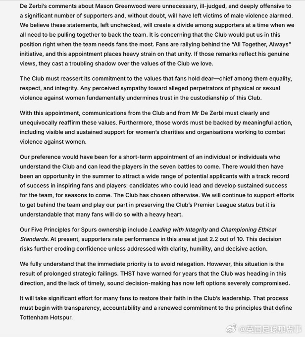 THST指出,俱乐部本可以进行短期任命,选择更合适的人选,但最终选择了德泽尔比,导致球迷信任受损。俱乐部必须通过透明、问责和实际行动恢复信任,包括支持女性慈善和反暴力组织。避免降级固然重要,但重建领导层的信任与价值承诺更为关键。